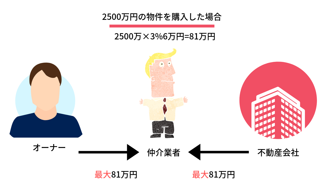 もう少しわかりやすく説明するために例を用います。もしあなたが2500万円の物件を購入すると、仲介業者は最大で81万円を請求することができます。