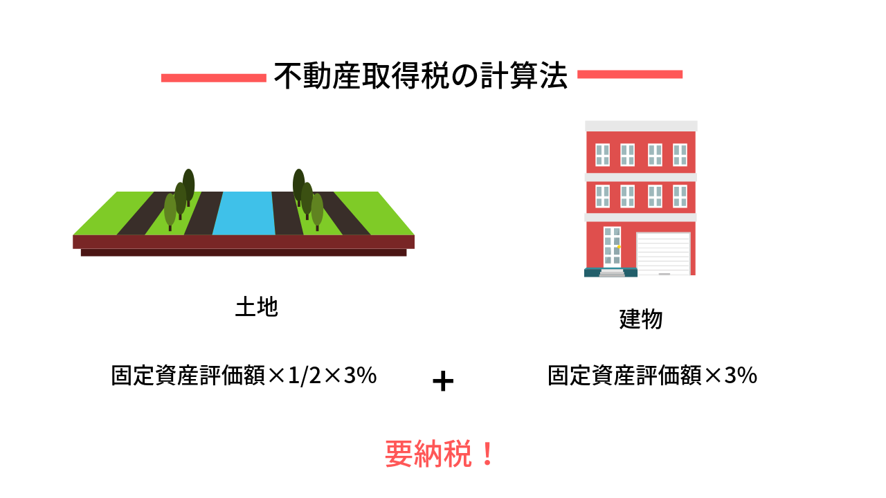 毎年市町村から支払い通知が届く固定資産税とは違い、 不動産を取得した場合に一度だけ払う税金です。1日でも所有権を取得した場合は税金の対象になります。