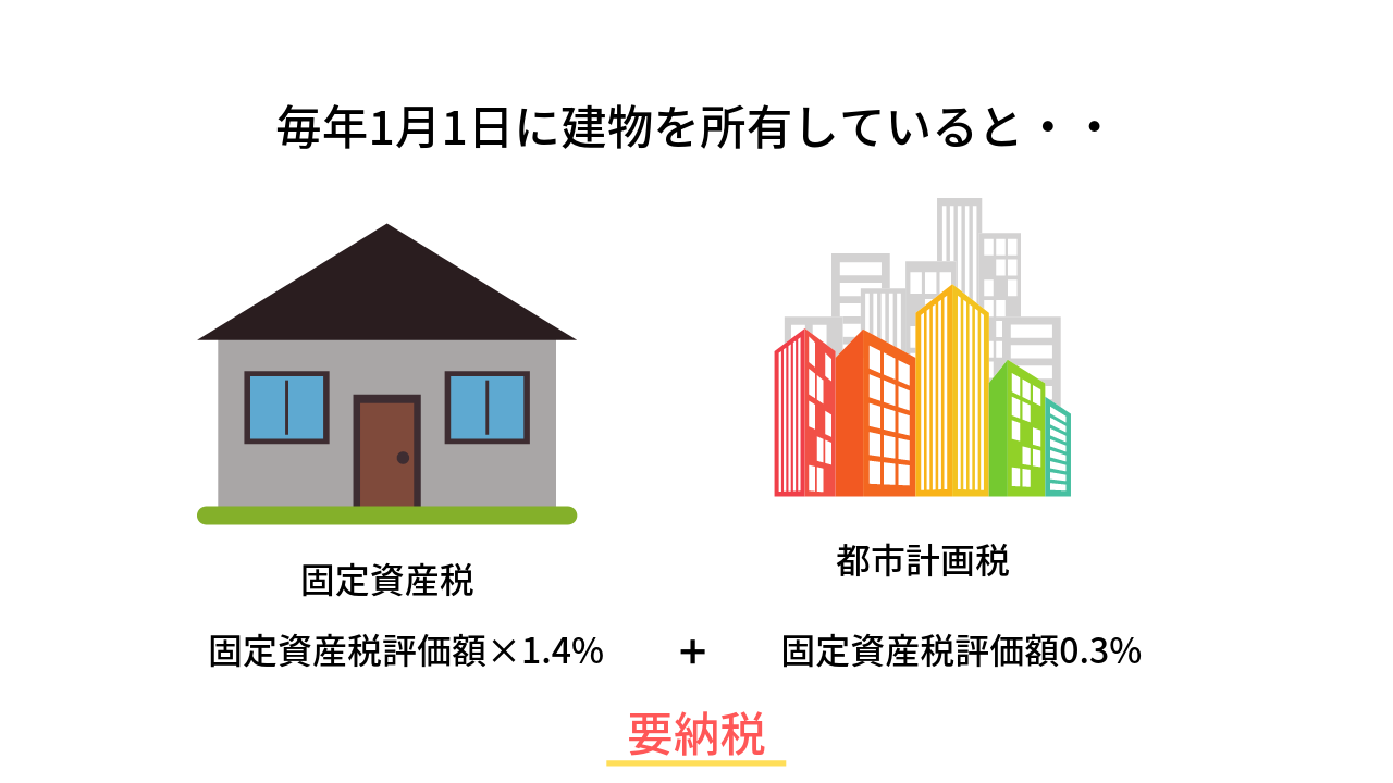毎年1月1日時点での物件所有者にかかる税率のため、1月2日以後に購入したものは税金を納める必要がありません!