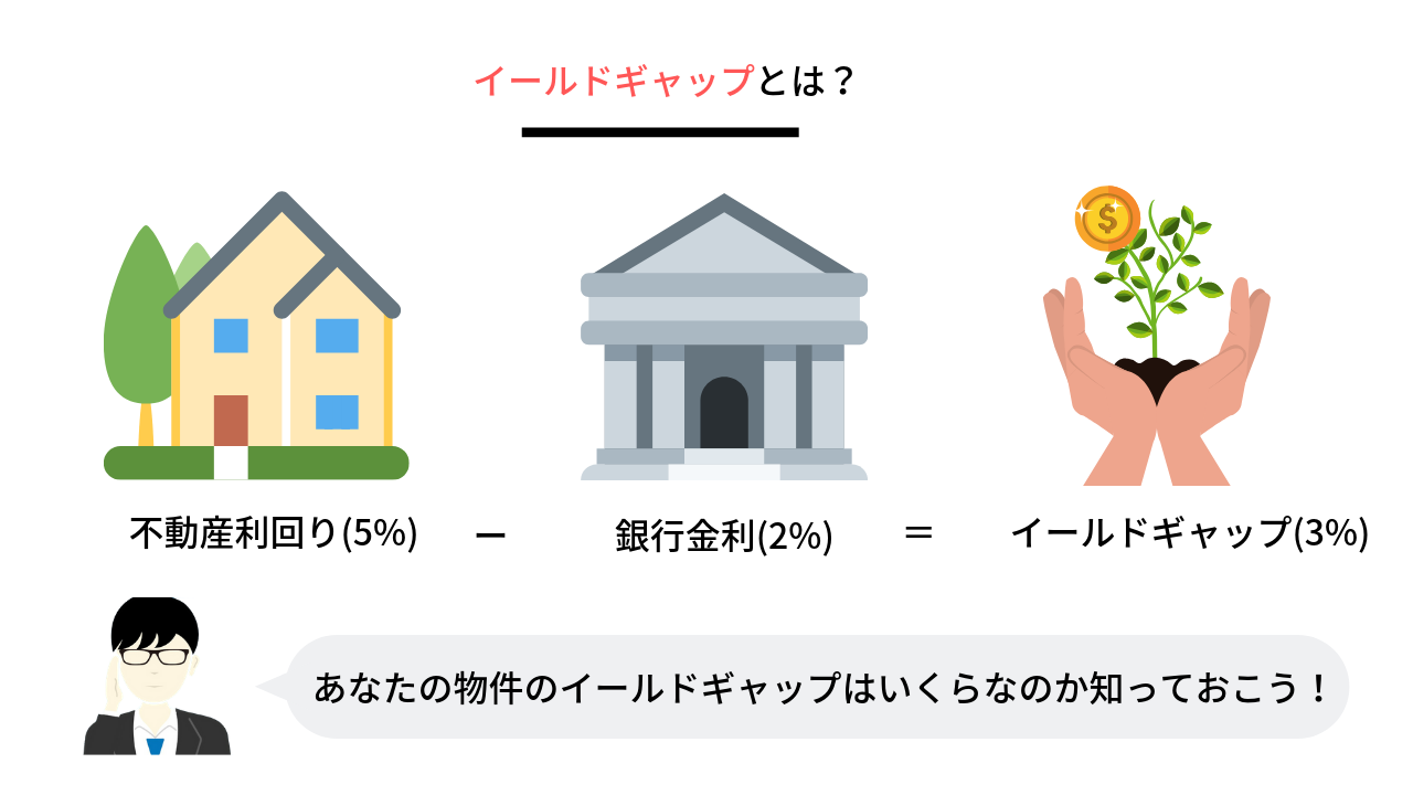 簡単にいうとイールドギャップは投資物件の利回りから、アパートローン(不動産投資用のローン)の金利を引いて求めた差のことをいいます。