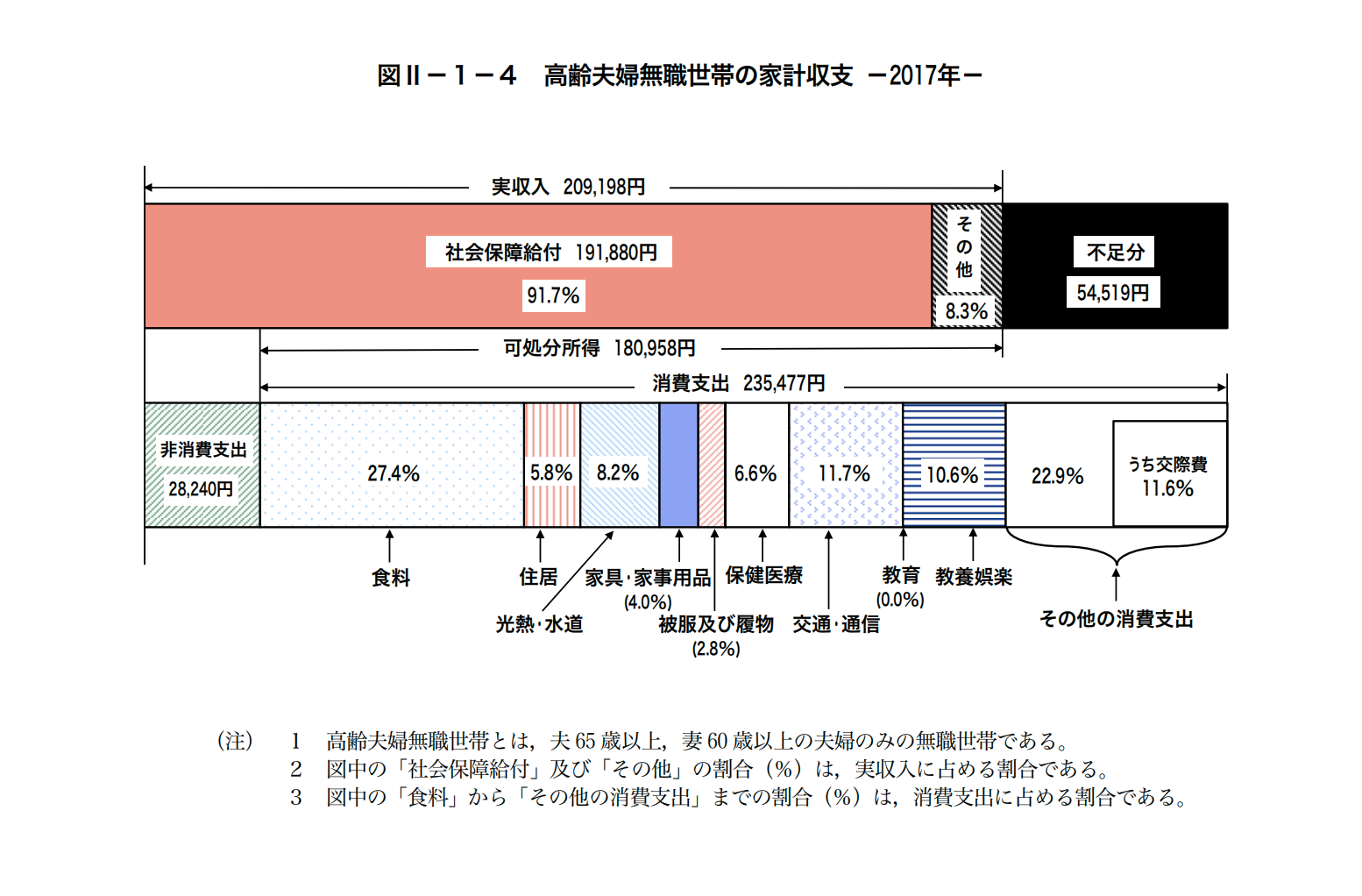 生命保険文化センターの平成28年度「生活保障に関する調査」によると最低必要な老後資金は夫婦2人で22万円となっております。一方、公的年金などで入ってくる手取りの収入(可処分所得)は、18万2980円で、毎月、約5万5000円が不足しています