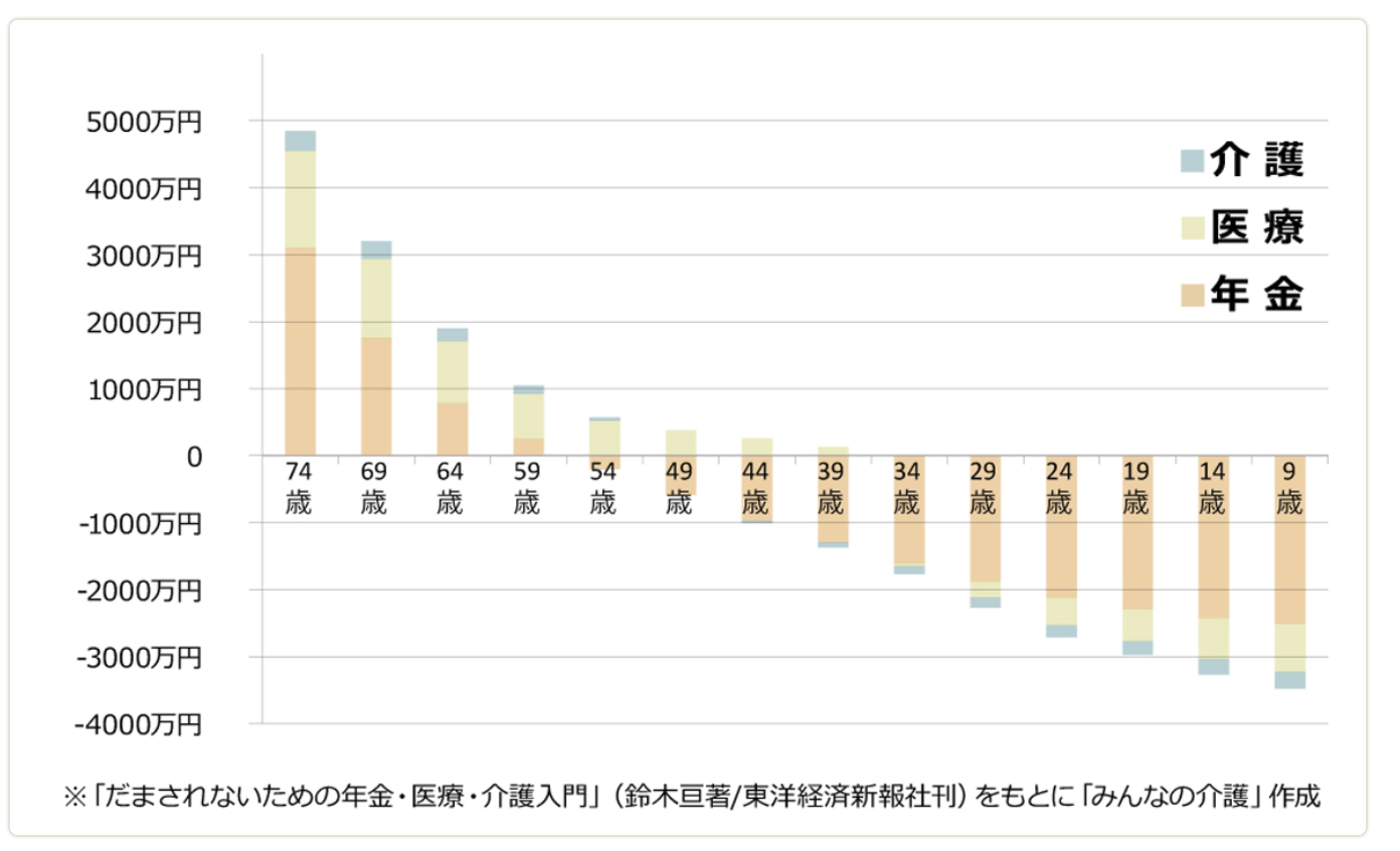 老人ホーム検索サイト『みんなの介護』の『60際以上は年金の「納め得」で、55際以下は「納め損」。世代間格差に見る社会保障費の問題とは?』記事を見ると、今20代から30代の方は年金で損する可能性が極めて高くなっております。