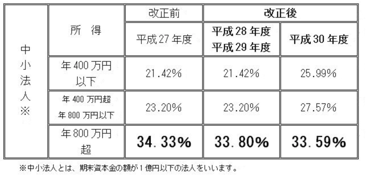 中小法人の法人税の実効税率は現在33%なので先ほどの個人の表と比較すると、一般的には課税所得が900万円を超えてくると法人にするか検討し始めた方が良いということになります。